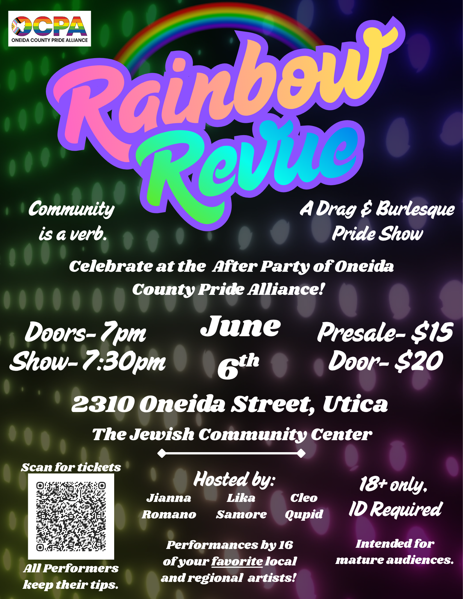 https://www.eventbrite.com/…/rainbow-revue-pride-after… or 20$ at the door. All ticket sales go directly to cast/crew.